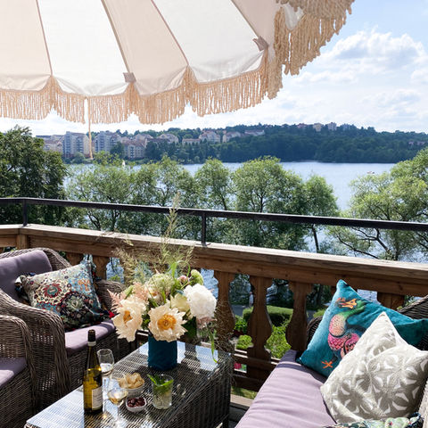 Vår terrass har en av Stockholms bästa utsikter över Ulvsundasjön och kvällssolen.